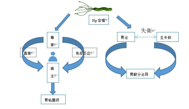 ① Hp定值后產生的毒素CagA和VacA可以直接或通過免疫反應對胃黏膜形成損傷